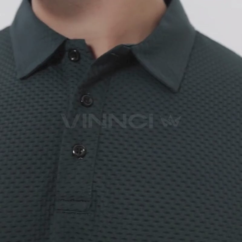 The Textured and Stretch Men's Polo is made from a soft, textured fabric that feels pleasant to the touch.